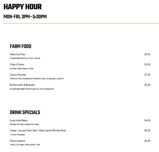 Monday - Friday 3:30 - 5:30 PM Food Specials: $3 Fries $3 Chips & Salsa $7.50 Classic Poutine $5Butterscotch & Beignets