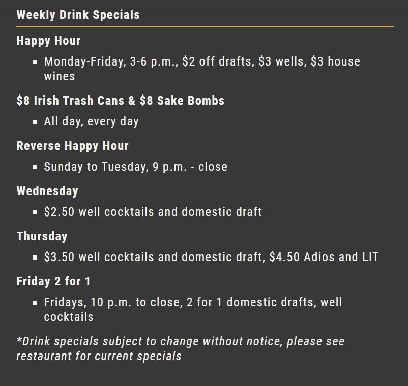 Monday: 20% off for NAU students, seniors, and downtown workers Tuesday: 20% off for NAU students, seniors, and downtown workers Wednesday: 20% off for NAU students, seniors, and downtown workers $2.50 well cocktails and domestic draft $0.75 WINGS ALL DAY Thursday: 20% off for NAU students, seniors, and downtown workers $3.50 well cocktails & domestic draft $4.50 Adios and LIT Friday: 20% off for NAU students, seniors, and downtown workers 2 for 1 domestic drafts, well cocktails (10 PM to close) Saturday & Sunday: $20 bottomless Football: $4 Shock Top, Bud Light, Budweiser, Michelob Ultra during ALL NFL games