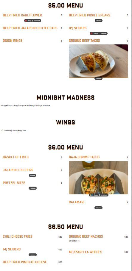 Daily 2 - 6 PM & 6 - 10 AM Food Specials: $4 Deep Fried Corn Nuggets, Mushrooms OR Zucchini $5 Deep Fried Cauliflower, Jalapeno Bottle Caps, Onion Rings, Pickle Spears, sliders OR ground beef tacos $6 Basket of Fries, Jalapeno Poppers, Pretzel Bites, Baja Shrimp Tacos OR Calamari $6.50 Chili Cheese Fries, (4) Sliders Deep Fried Pimento Cheese Ground Beef Nachos OR Mozzarella Wedges Wings: 1/2 off