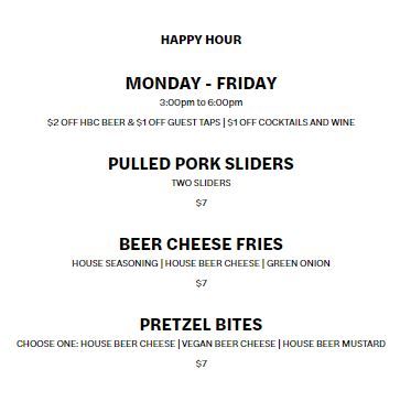 Monday - Thursday 3 - 6 PM Food Specials: $2 off loaded pub fries, fried brussels sprouts & soft pretzels Drinks Specials: $1 off draft beer, draft wine and wells $8 Margarita $10 Mules $10 Old Fashioned
