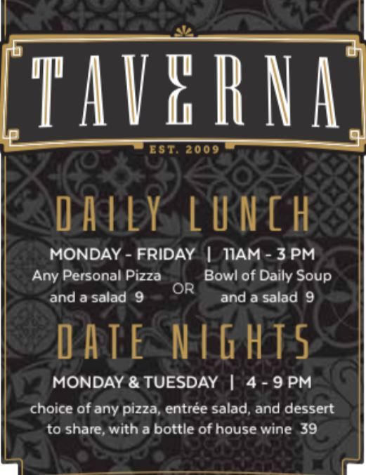 Monday & Tuesday 4 - 9 PM $39 pizza, entree salad, and dessert for two with a bottle of house wine